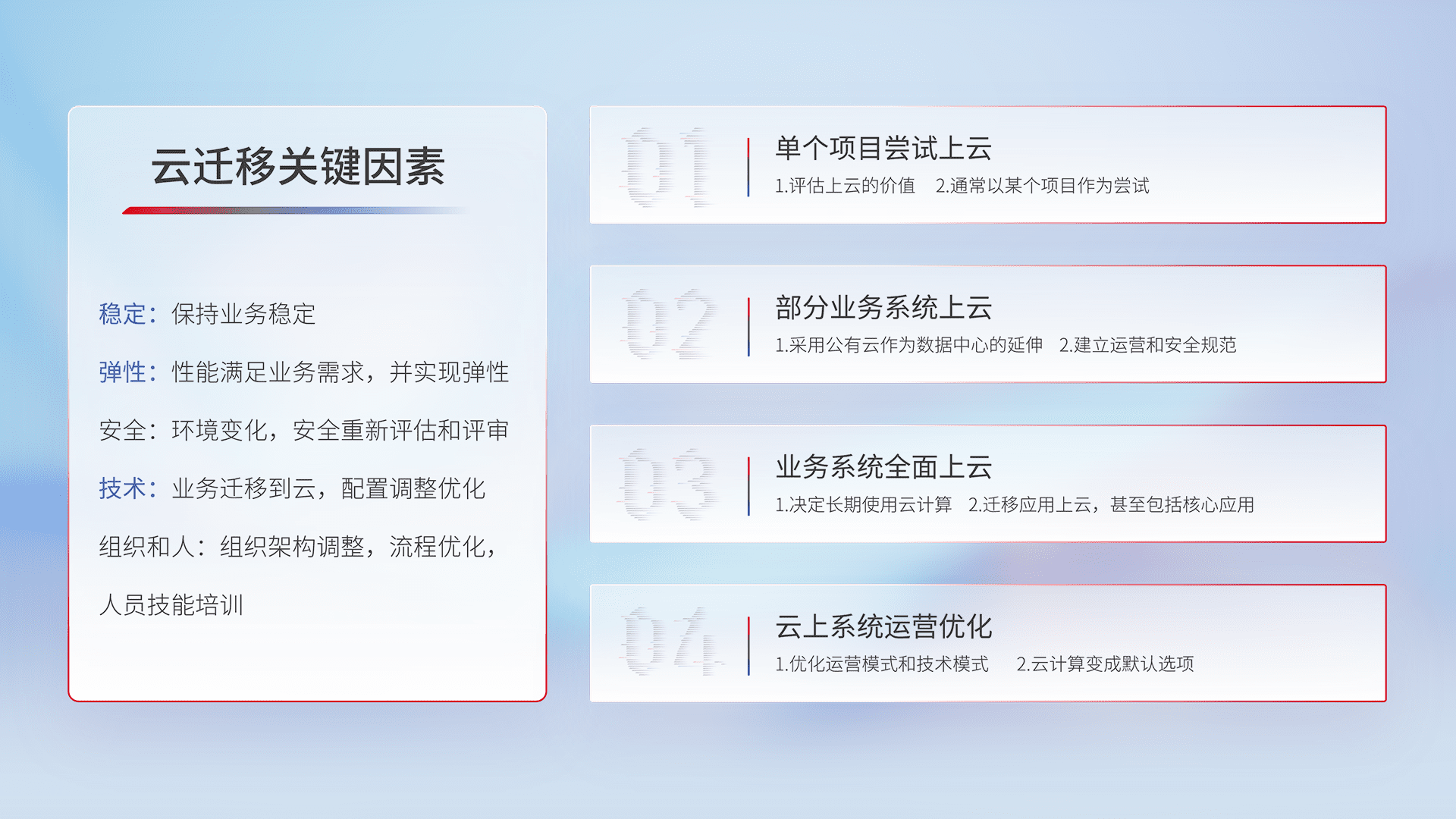 结合实际业务,,,从规划设计、、、、云平台选型、、、、云原生改造、、数据迁移、、、集成交付,,,迁移全过程为客户识别最佳上云路径,,,,做好风险识别管理,,,,设计网络架构、、身份权限、、、、安全审计合规、、操作审计、、、日志审计、、、、监控告警策略、、、多站点容灾设计等,,,,对云上基础设施进行整体规划,,提升IT治理水平,,以满足弹性、、、高可用、、高性能的需求。。。