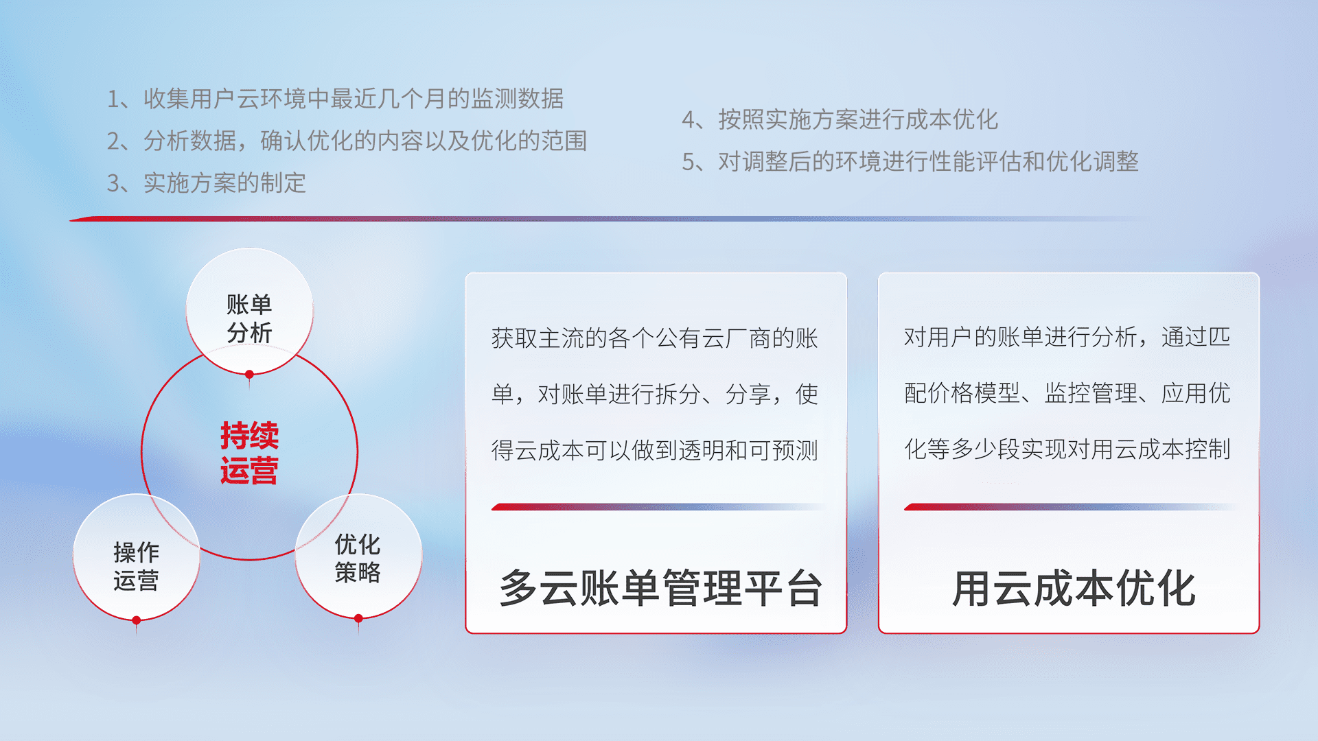 通过多云纳管,,以统一的资源数据模型把客户的云资源进行抽象和封装,,,进而实现对多云资源的统一操作,,,保障云资源管理的可靠性、、、稳定性与可用性。。量身定制化运维内容,,,,配置、、、、开发运维、、、、补丁管理、、、、备份、、监控、、、、认证和访问管理、、、、审计和日常巡检等,,,保障在用云过程中的可靠度,,,稳定度以及高可用率。。。。